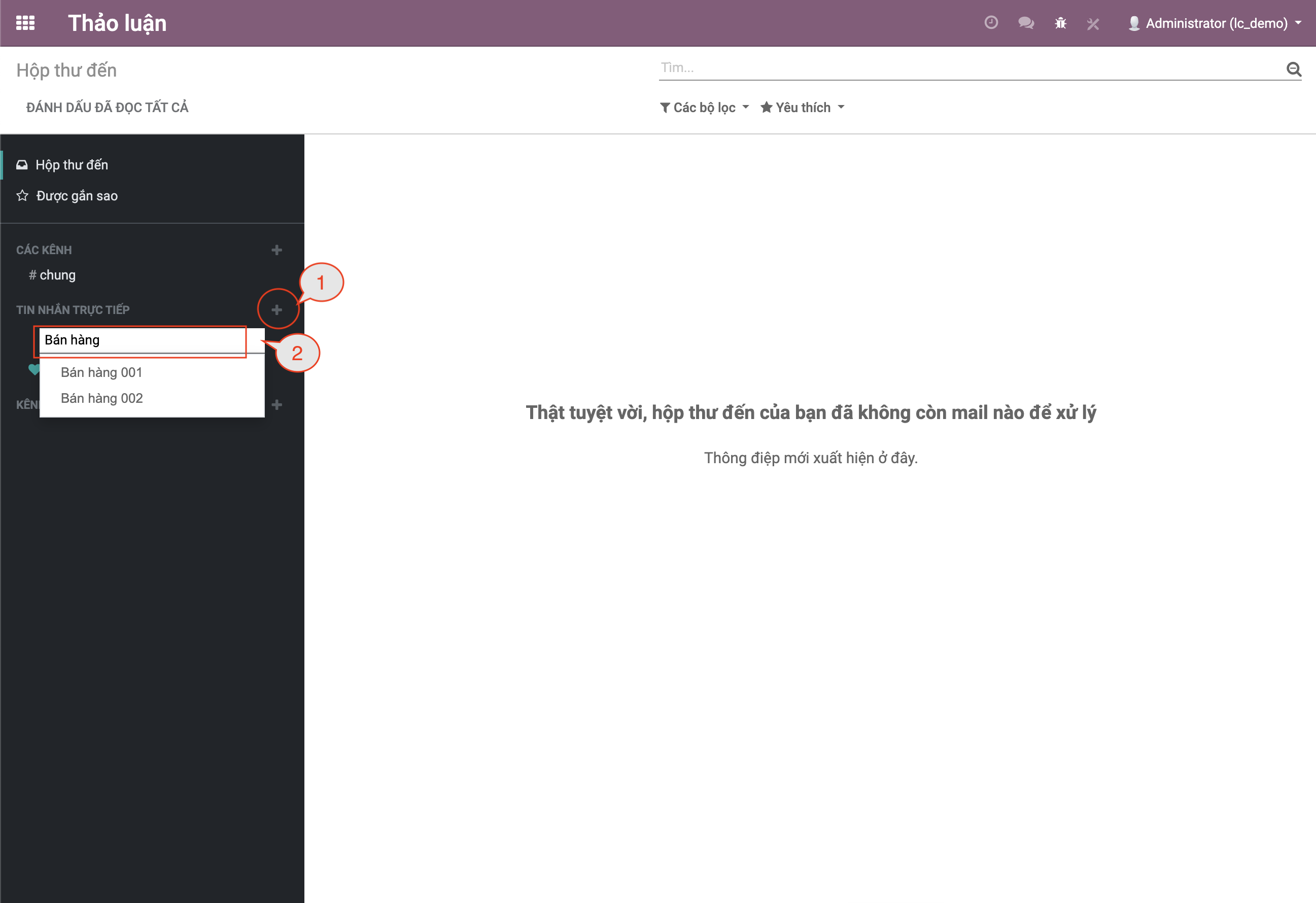 Bước 1: Tại màn hình chính của công cụ Thảo luận, bấm vào dấu “+” tại mục TIN NHẮN TRỰC TIẾP.