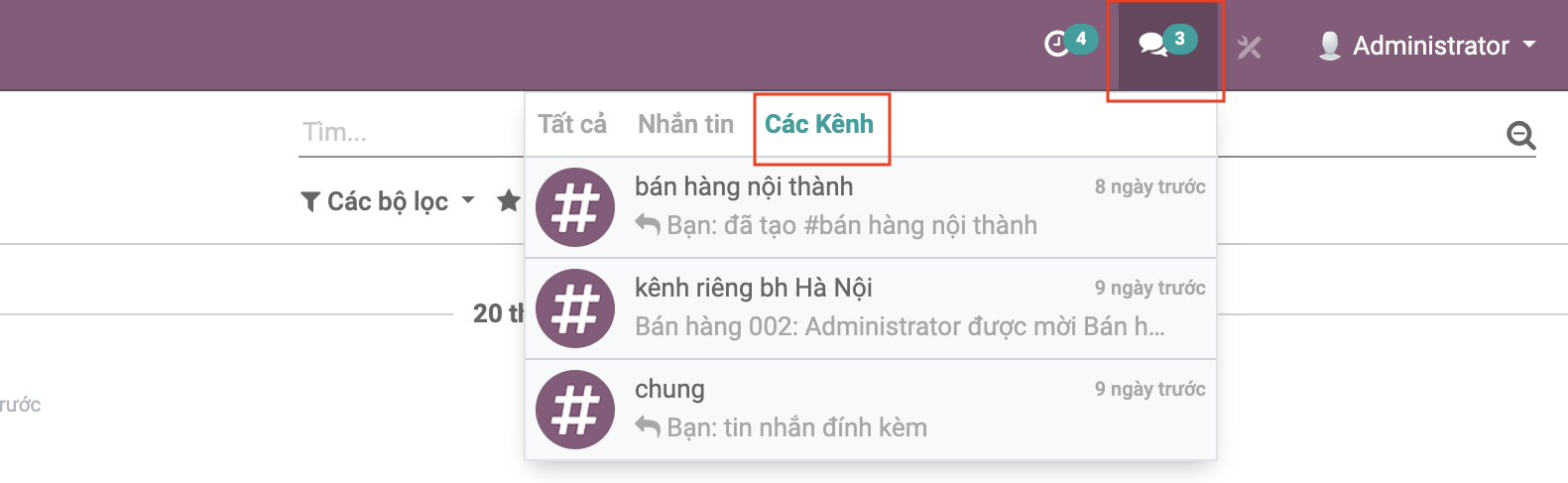 Hệ thống hiển thị danh sách tin nhắn được nhóm các tin thành 3 nhóm: tất cả, nhắn tin (tin nhắn trực tiếp) và kênh.