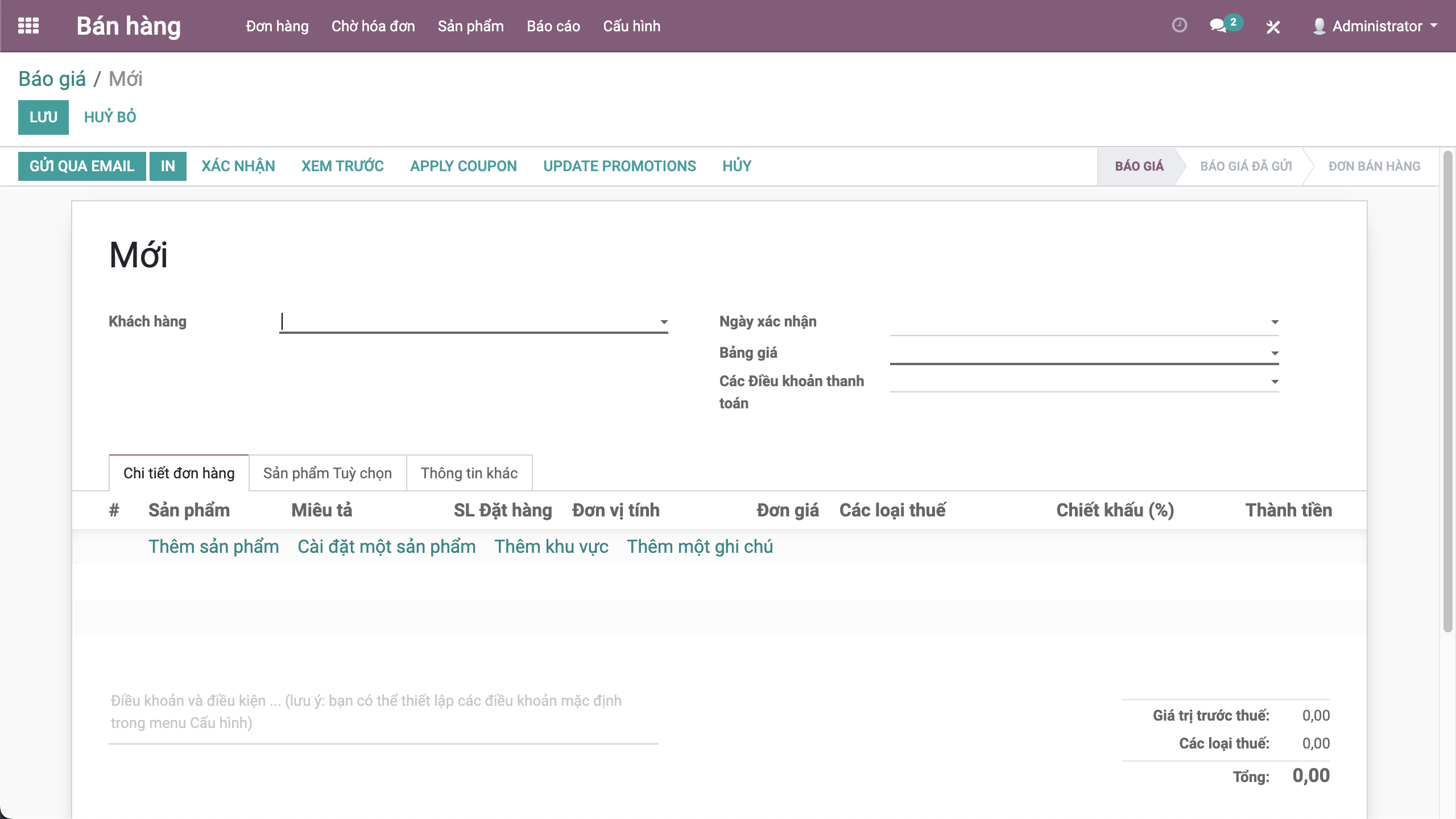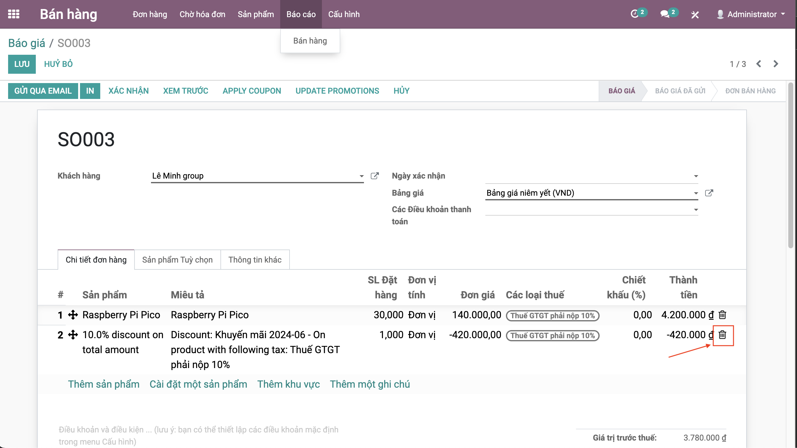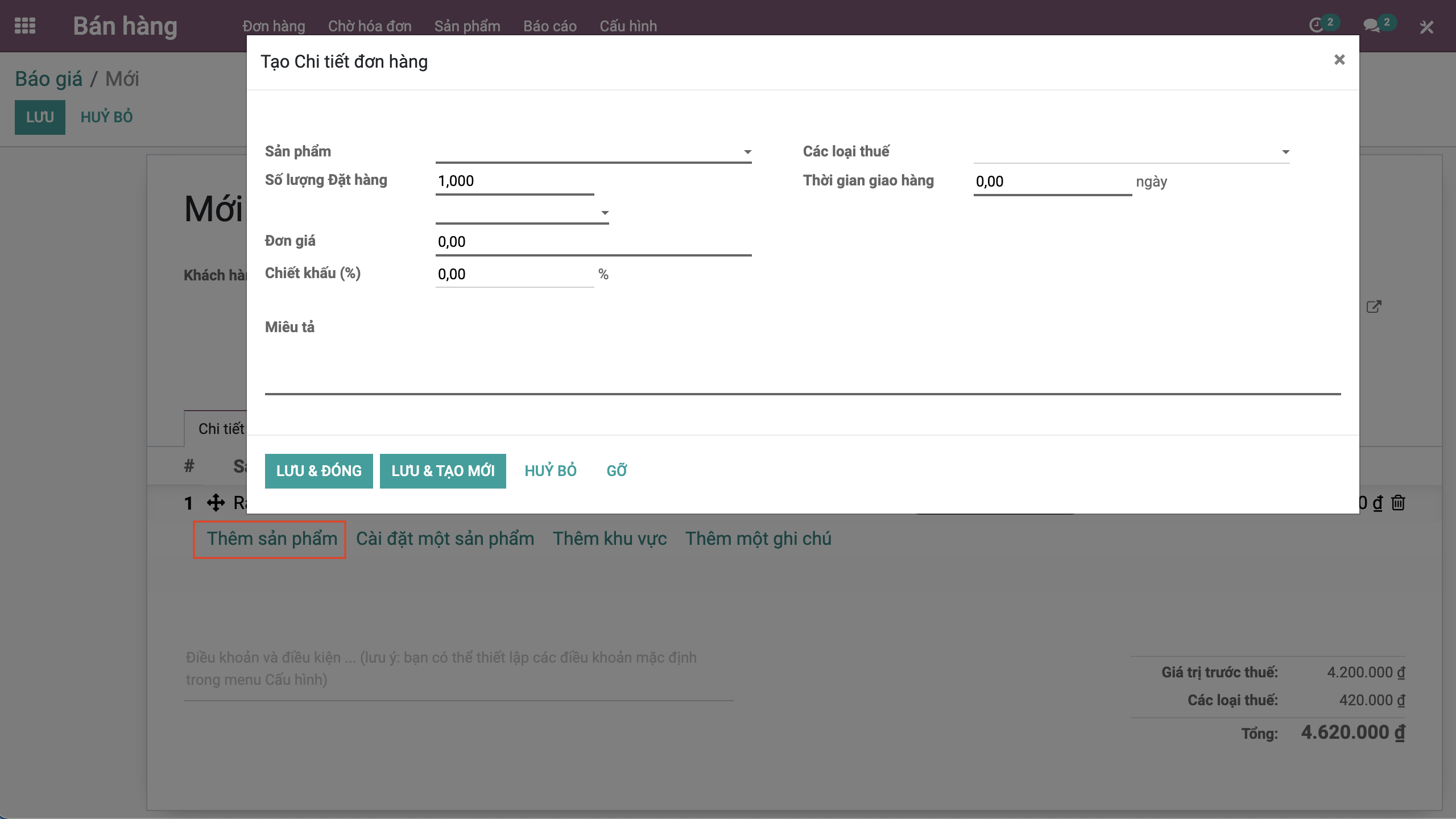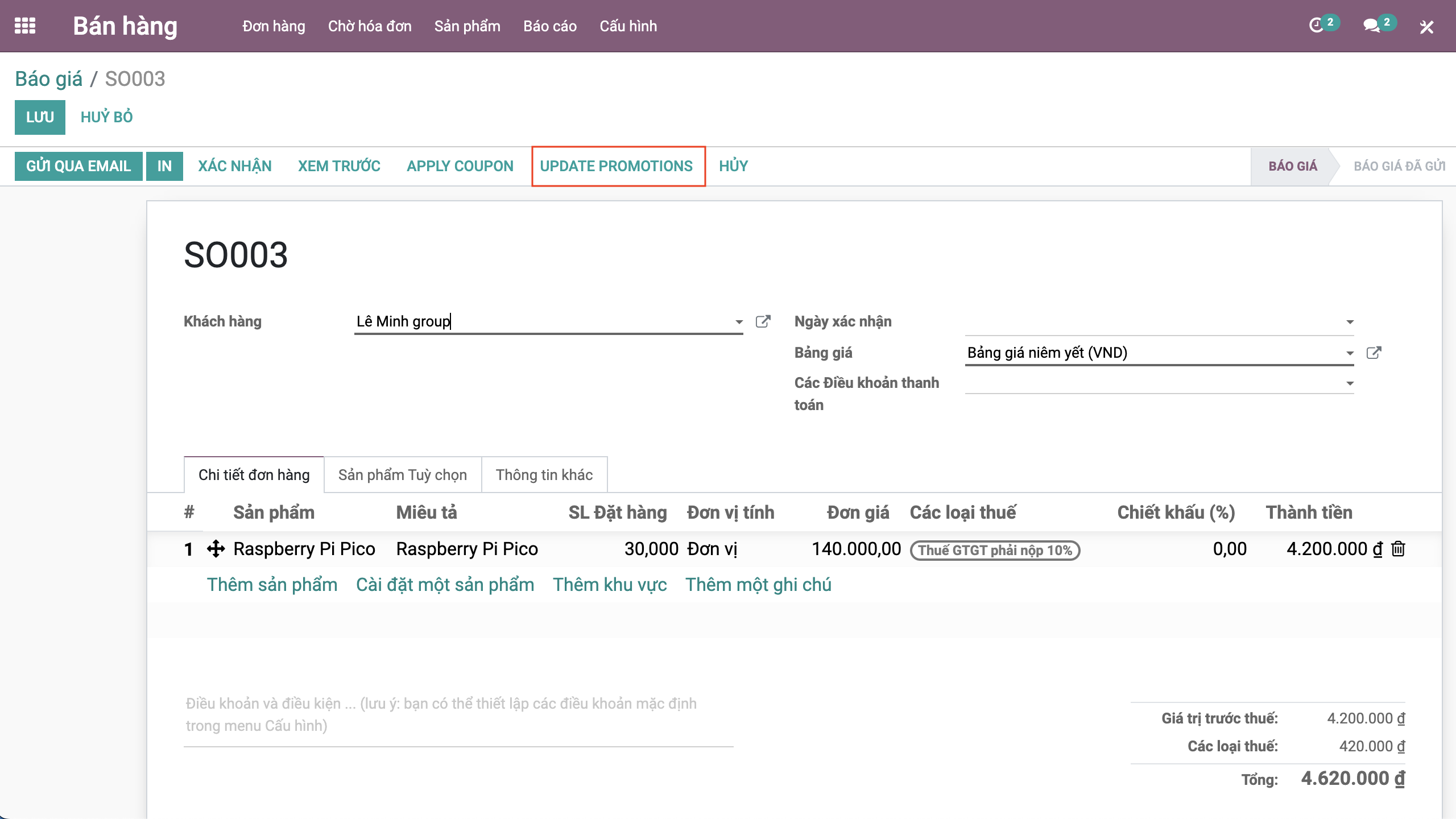 Bước 3: Bấm Lưu để lưu đơn hàng trạng thái Báo giá.