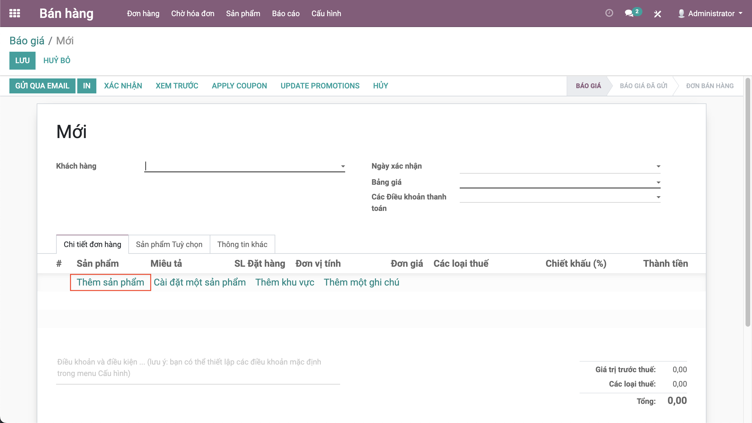 + Mục Sản phẩm tùy chọn: Bấm Thêm một dòng để thêm các sản phẩm tùy chọn (gợi ý bán) cho khách hàng. Các sản phẩm này chỉ mang tính chất tham khảo cho khách hàng, không tính vào giá trị của đơn hàng.