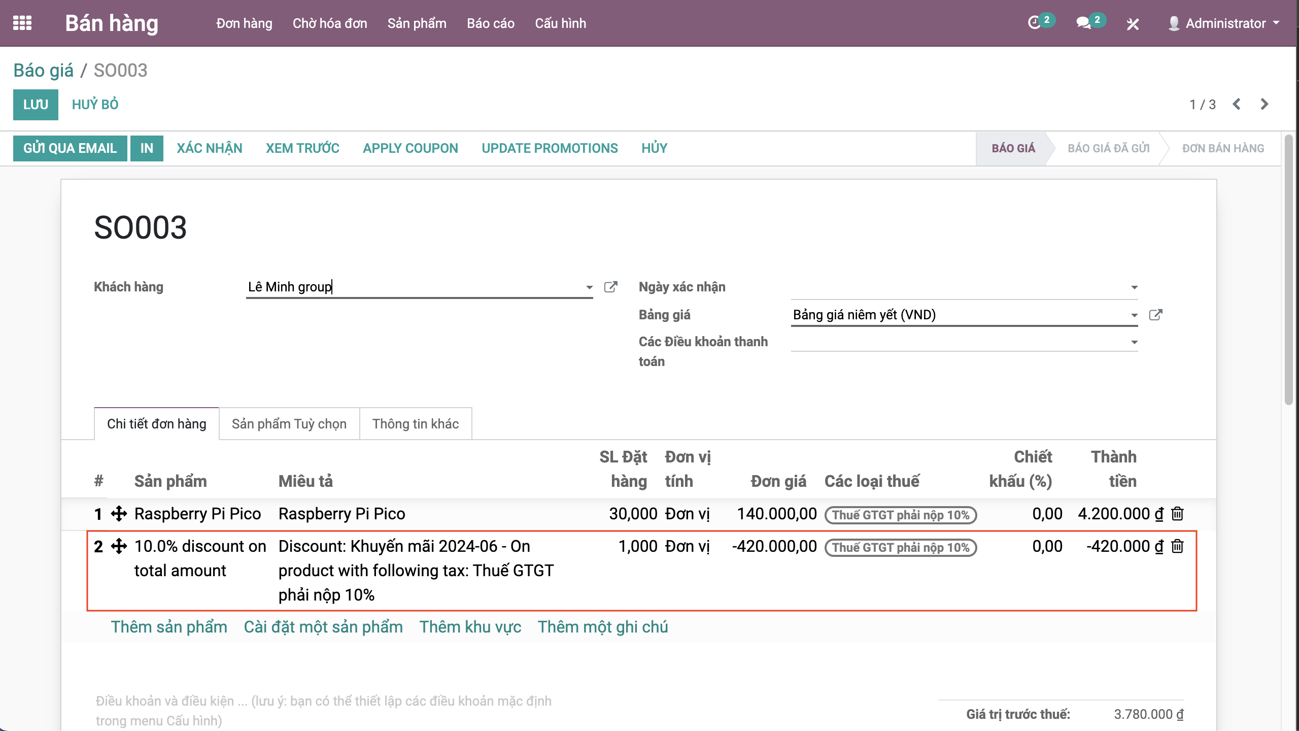 Chương trình được áp dụng sẽ được hiển thị tại mục Chương trình khuyến mại. Và tại Chi tiết đơn hàng sẽ hiển thị thêm các dòng khuyến mại.