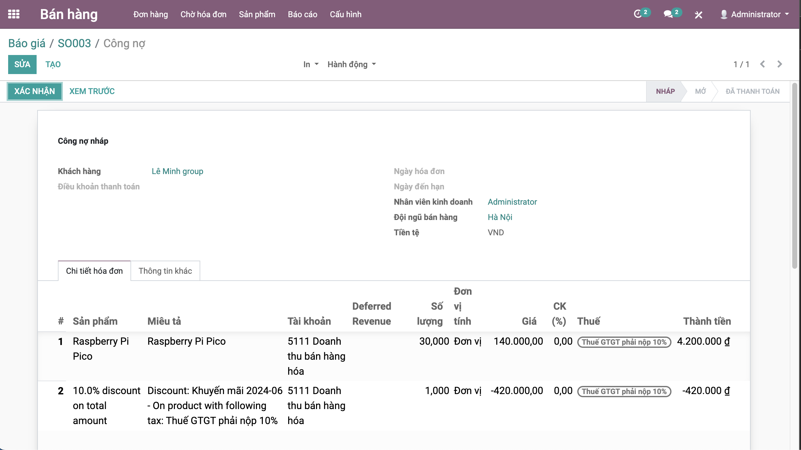 + Bấm Xác nhận để xác nhận hóa đơn công nợ >> hóa đơn chuyển sang trạng thái Mở.