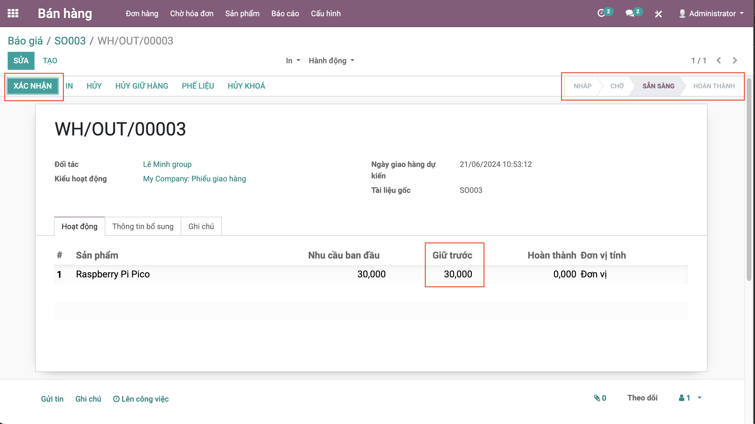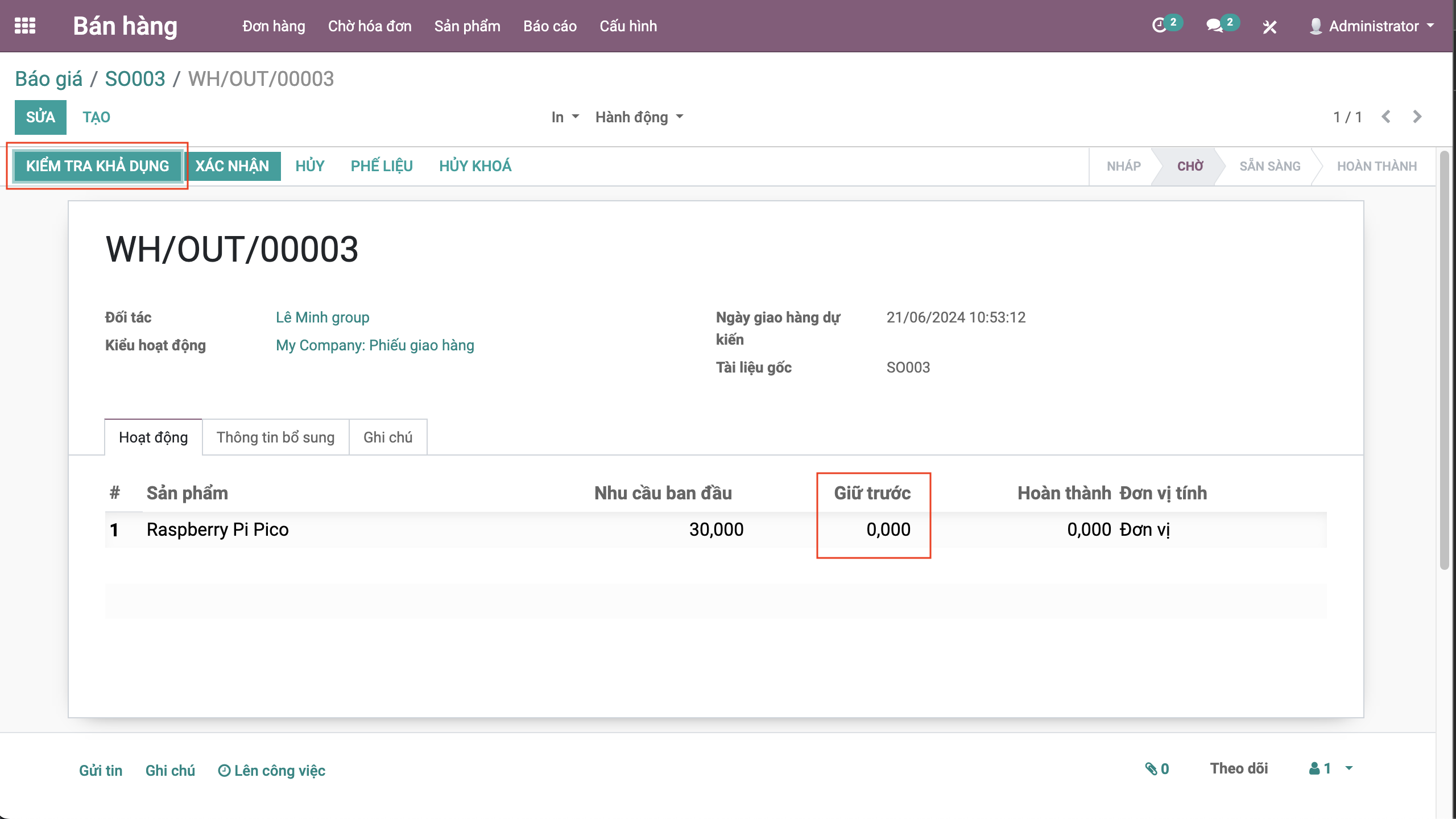 + Tại phiếu giao hàng: bấm nút Kiểm tra khả dụng để kiểm tra xem tại kho đang chọn có đủ hàng để xuất cho khách hàng hay không. Nếu không đủ tồn, phiếu kho vẫn ở trạng thái Chờ . Nếu đủ, phiếu kho sẽ chuyển sang trạng thái Sẵn sàng và các sản phẩm đủ điều kiện xuất đi sẽ được hiển thị tại mục Hoạt động chi tiết như hình.