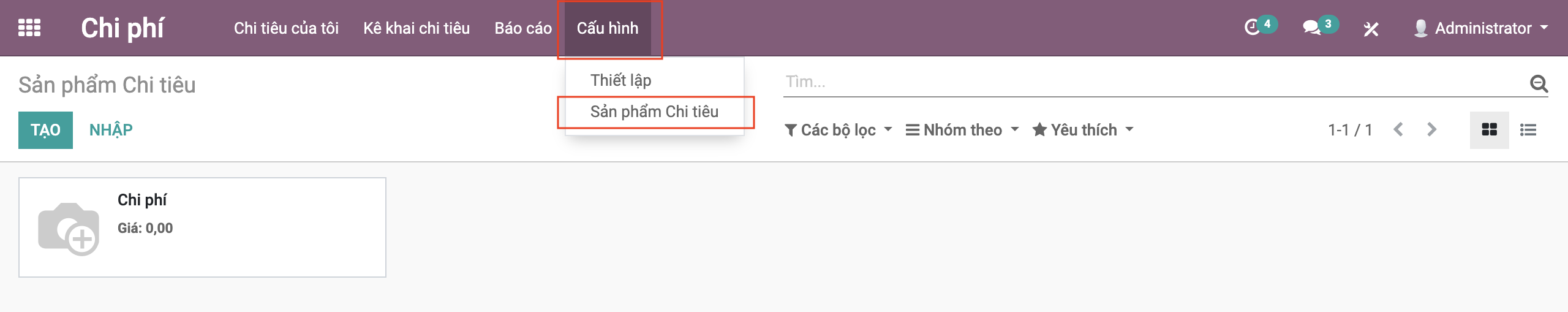 Bước 1: Tại màn hình Chi phí >> Cấu hình >> Sản phẩm chi tiêu