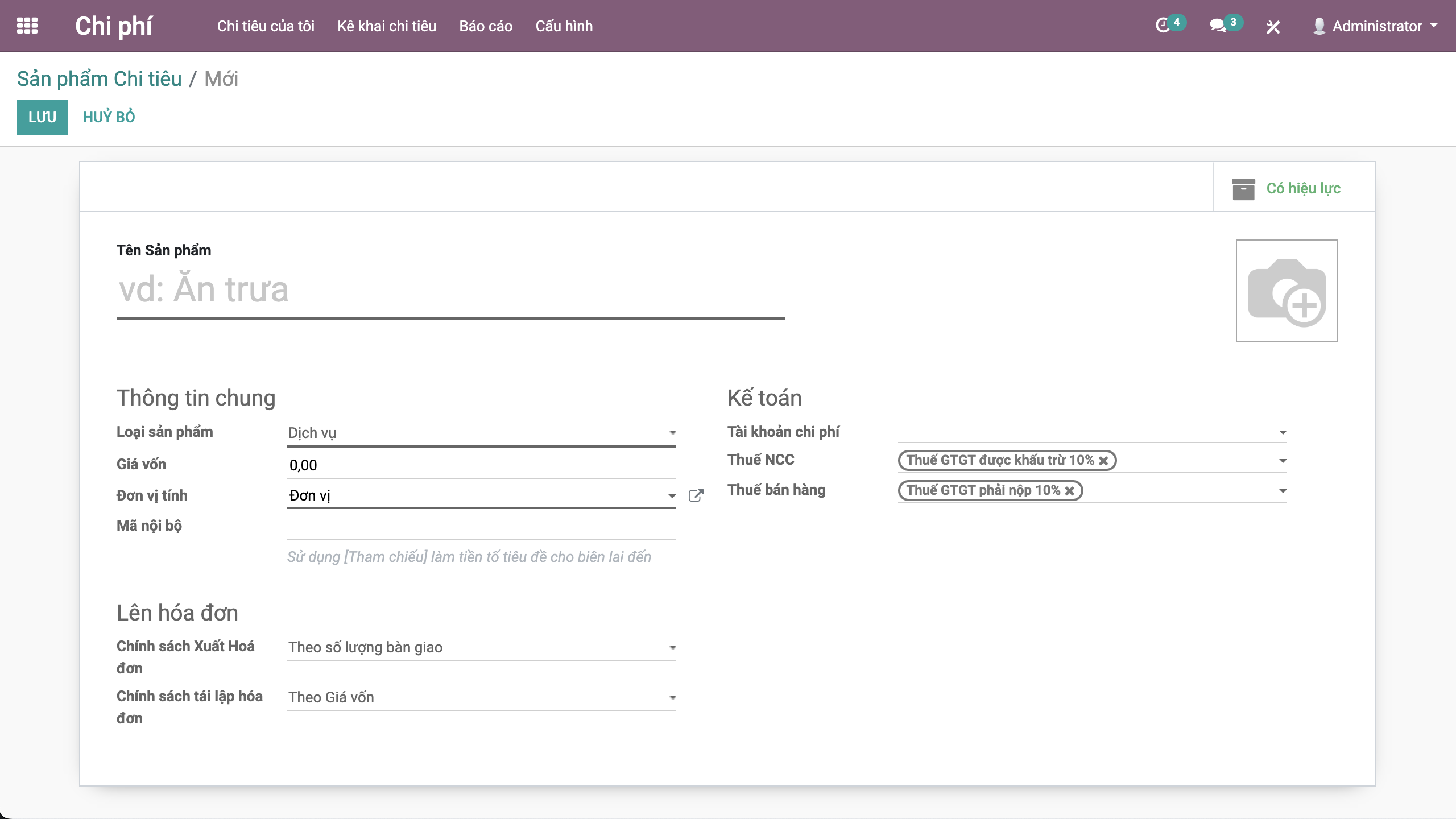 Phần mềm Quản lý chi phí Odoo với chức năng Sản phẩm chi tiêu sẽ giúp người dùng tạo các sản phẩm được chi tiêu.
