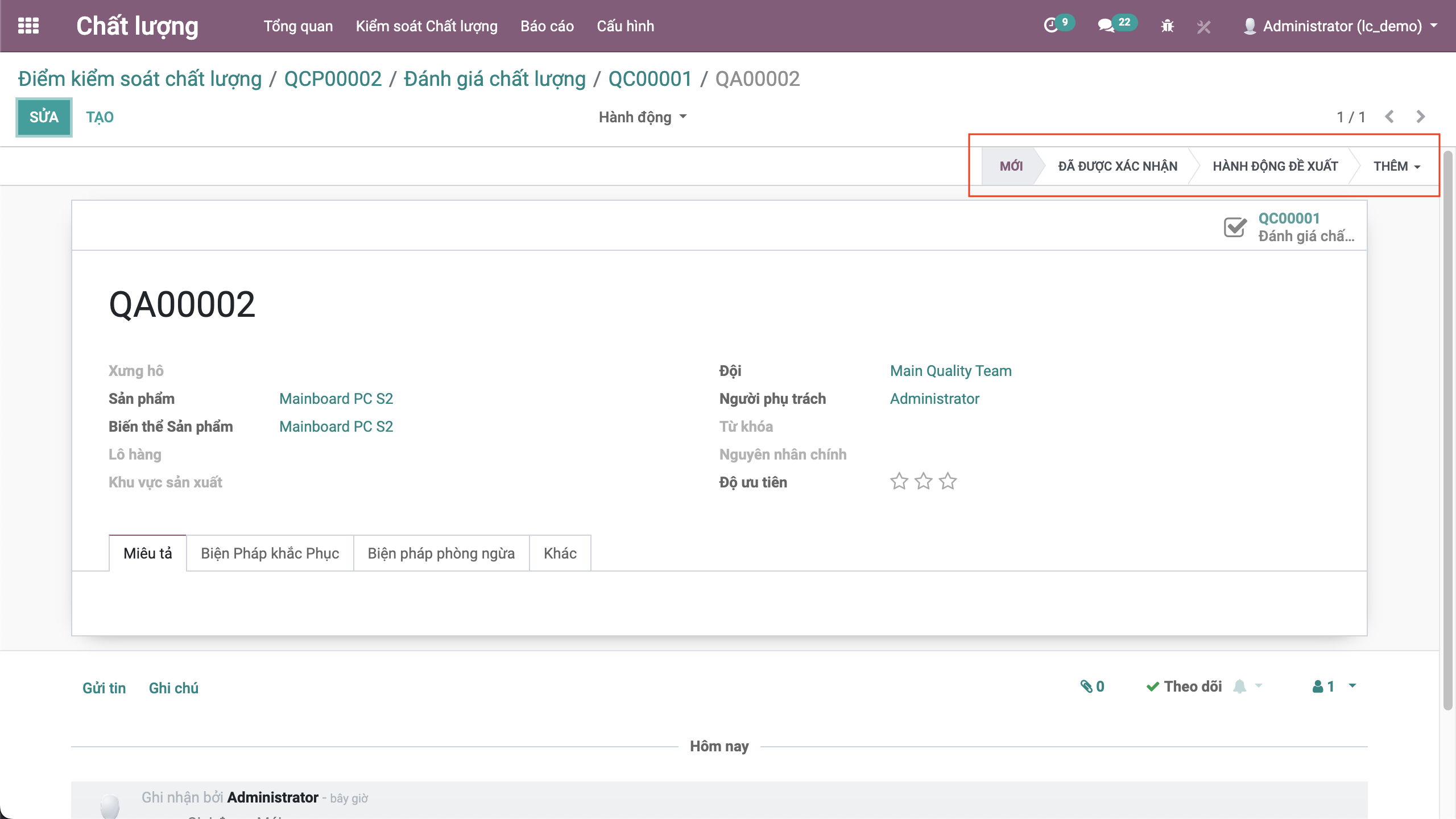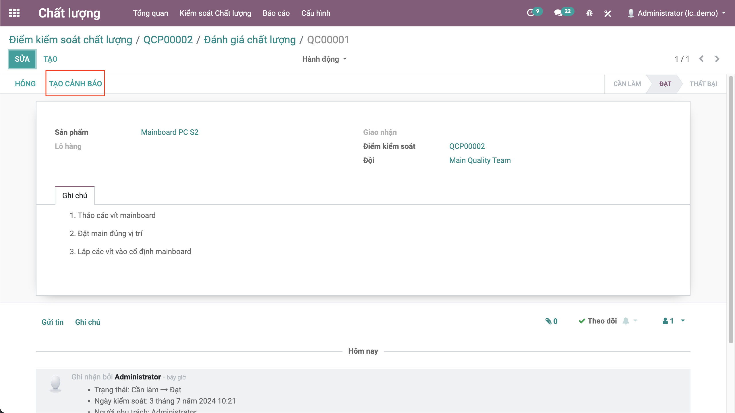 Bước 1 : Bạn có thể tạo mới 1 cảnh báo chất lượng ngay sau khi đánh giá chất lượng của sản phẩm xong. Trên form Điểm kiểm soát chất lượng, người dùng bấm vào Cảnh báo
