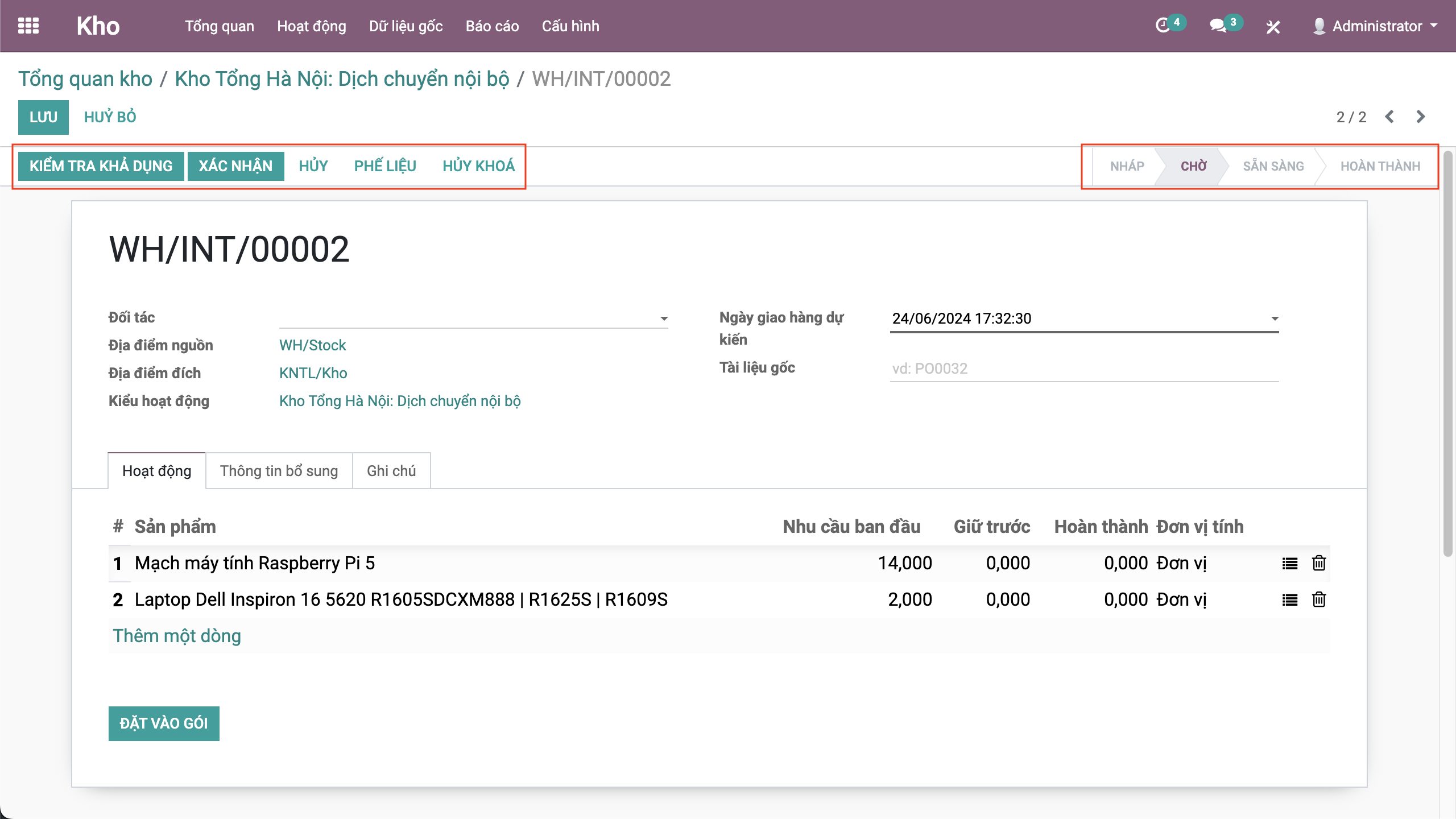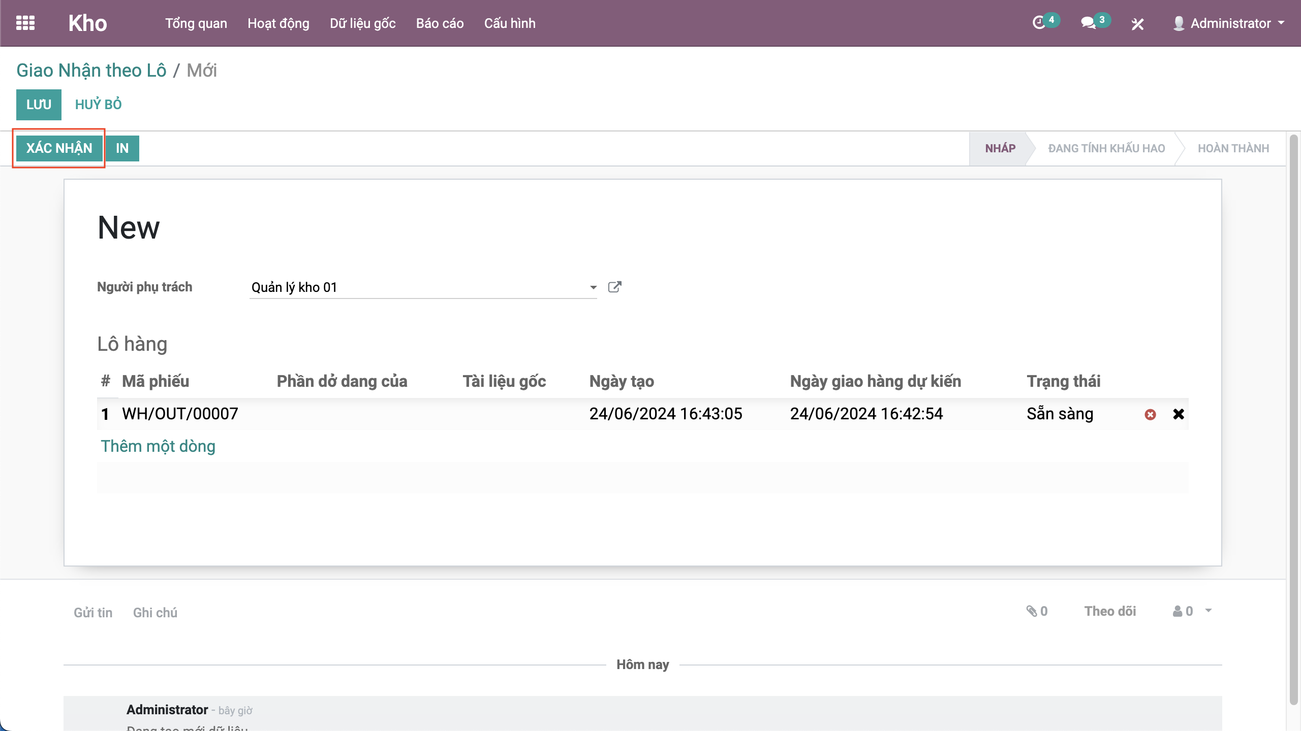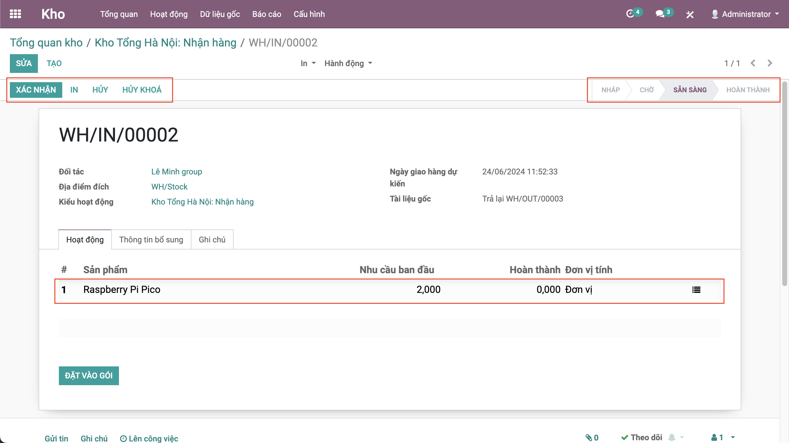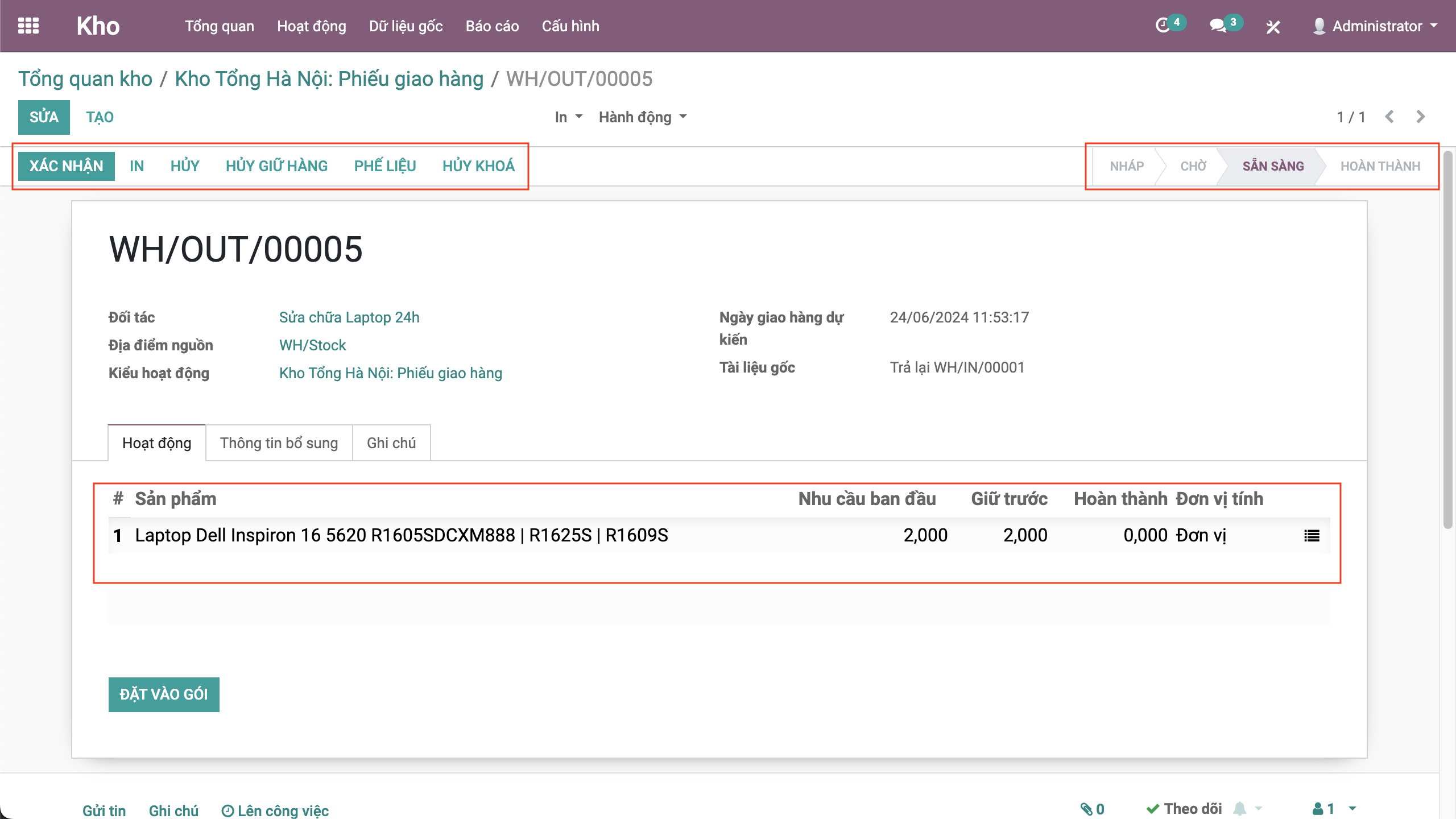 - Nếu đủ hàng sẽ chuyển trạng thái sẵn sàng, việc của nhân viên vào sẽ xuất hàng theo số lượng đang có, bằng click xác nhận hoặc nhập số lượng hoàn thành.